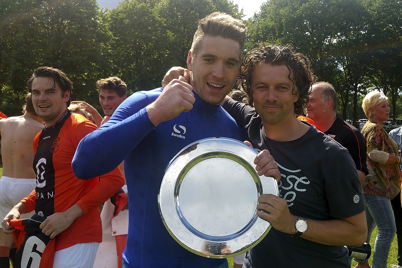 Bij het feest op het veld in Eersel was ook Joey Kohlen aanwezig. De gewezen aanvoerder, op 31 mei 2015 overleed hij op drieëntwintigjarige leeftijd door een tragisch auto-ongeluk, leeft voort in alle harten: in het clubhuis staat een statafel met zijn naam en rugnummer als een shirt geschilderd op het tafelblad, Joey’s tricot gaat in normaal en groot formaat altijd mee bij belangrijke wedstrijden. De voormalige nummer 6 was niet alleen aanvoerder. Het gezelligheidsdier nam op het veld en in de kantine altijd, met gevoel voor zijn voetbalmaten, het voortouw. Trainer Roel Sloesen, hij speelde nooit in een eerste elftal, begon bij Venlosche Boys als trainer van de D-junioren, eerde na de promotie ook zijn oorspronkelijke aanvoerder. De Feyenoord-fan praktiseert bij Venlosche Boys het hand-in-hand-de-kameraden. Eind mei bracht de hij de ouders van Joey bloemen. Op Facebook deelde Sloesen zijn diepgewortelde vreugde: “4 jaar geleden kreeg ik de kans om bij 1 aan de slag te gaan. Vandaag promoveerden we voor het eerst in de historie naar de 1e klasse met een team dat voor 90% uit eigen jeugd komt. Trots op mijn Boys. Trots op Venlosche Boys. Trots op mijn aanvoerders Joey Kohlen en Ruud Stienen. Zo mooi dit!”